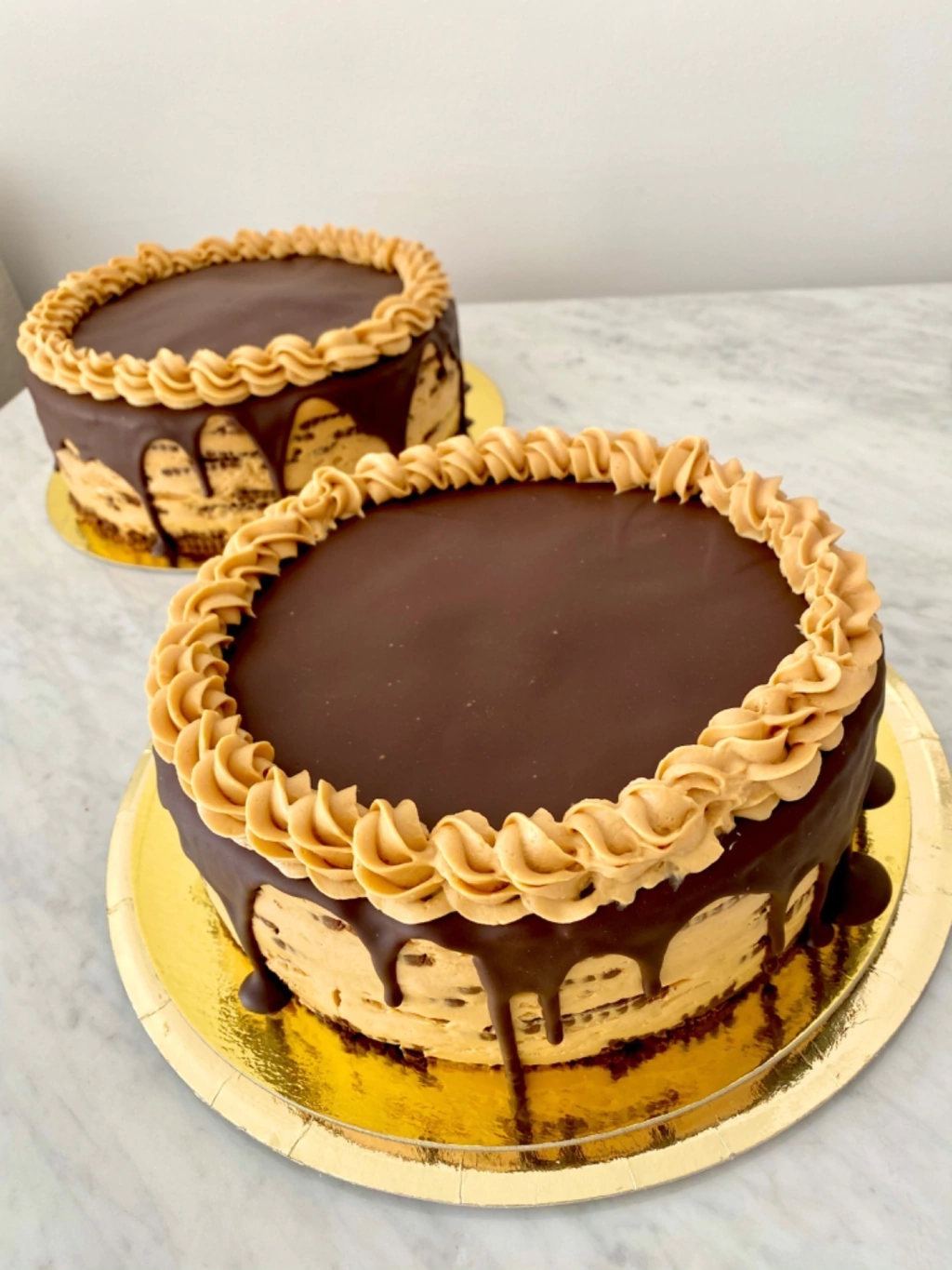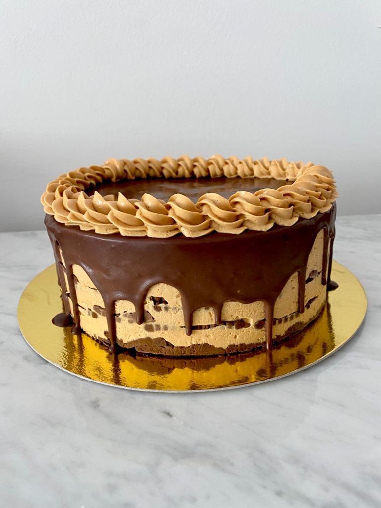 Clásica chocotorta, base de galletitas chocolinas súper húmedas mas la combinación perfecta de queso y dulce de leche. De decoración agregamos un drip de chocolate semi amargo.