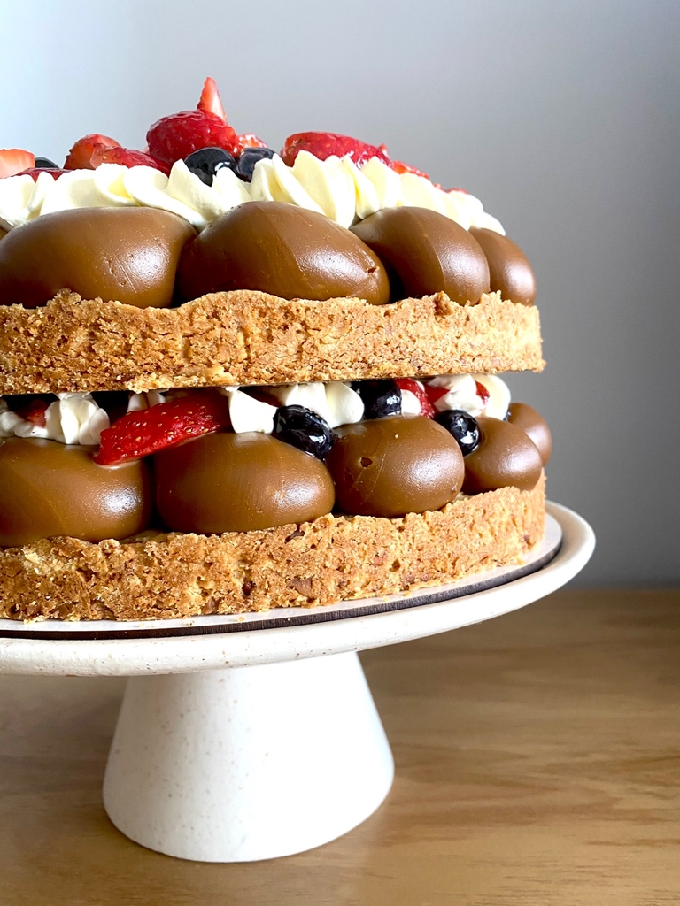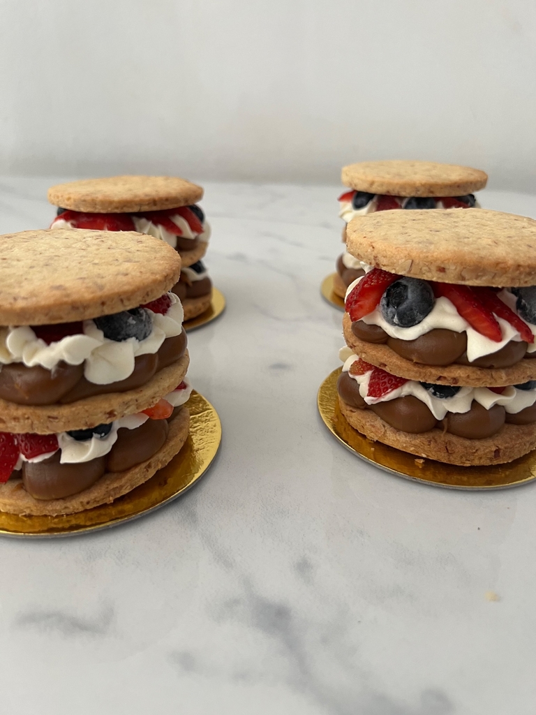 Sablee de Almendras tostadas con dulce de leche, crema chantilly y frutos rojos